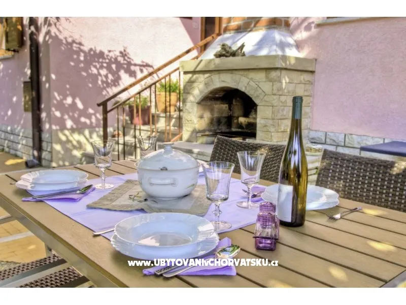Kuća za odmor od 100 m2 sa dvije terase i dvorištem sa roštiljem, kuhinjom, tri spavaće sobe, kupatilo, odvojeni wc, blagovaonicom i dnevnim boravkom.