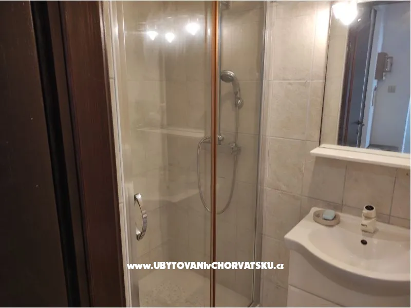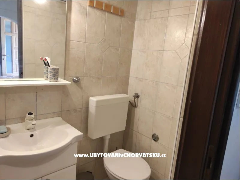 Kuća s dvorištem i natkrivenim parkiralištem u mirnom starom dijelu mjesta, udaljena od plaža 25 min pješice i 5 min autom, u prizemlju terasa s nadstrešnicom, vrt, vanjski tuš, roštilj, open space blagovaona, dnevni boravak i kuhinja (pećnica, perilica suđa, mikrovalna, aparat za kavu), soba, kupaonica, perilica rublja, a na katu soba s velikom terasom s pogledom, wi-fi.