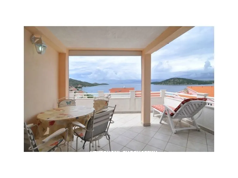Ovo je novouređen i potpuno opremljen 2+2 apartman sa 1 sobom, dnevnim boravkom sa sofom za 2 osobe, kupaonicom i terasom sa pogledom na more.