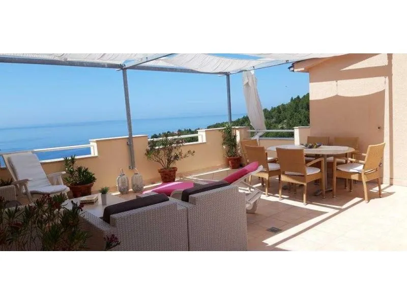 Apartman za 5 osoba, 2.kat, 45m2. 2 sobe, kuhinja, kupatilo i terasa s pogledom na more. Soba 1: bračni krevet 160x200 cm + krevet 90x200cm. Soba 2: bračni krevet 160x200 cm. TV, klima uređaj i WI-FI Internet. Parking. Roštilj. Perilica na upit.