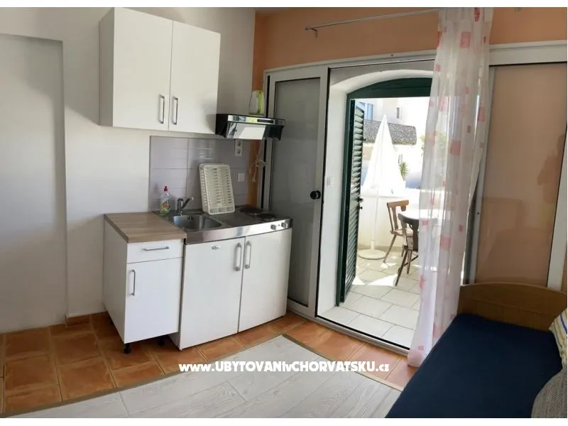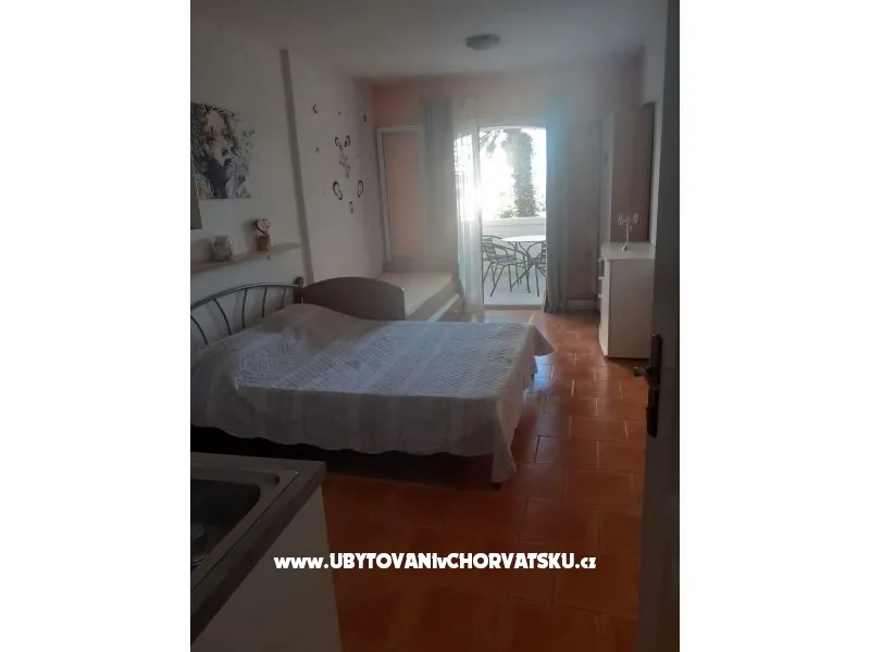 Studio apartman sadrži sobu sa bracnim krevetom i krevetom ispod kojeg se nalazi pomoćni lezaj,mini kuhinju,kupatilo,balkon sa pogledom na more.