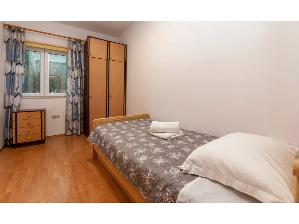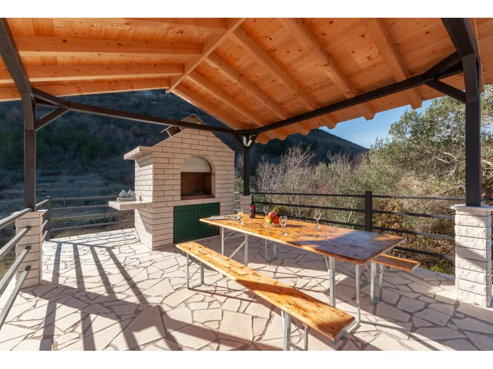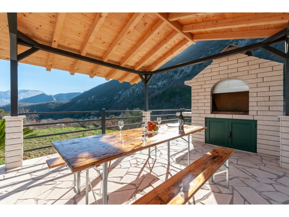 Kuća se nalazi u prekrasnoj prirodi s pogledom na okolna brda i planine. Ima jednu spavaću sobu s bračnim krevetom, plus dvije odvojene sobe s pojedinačnim krevetima, kupaonicu s tušem, kuhinju i veliki dnevni boravak s kaučem na razvlačenje. Velika natkr