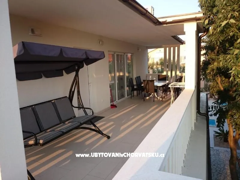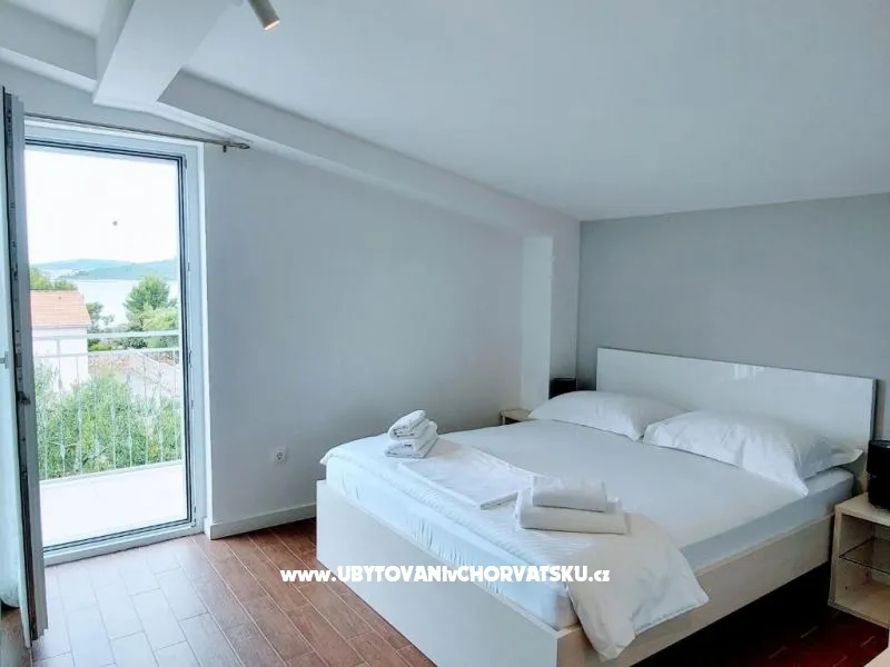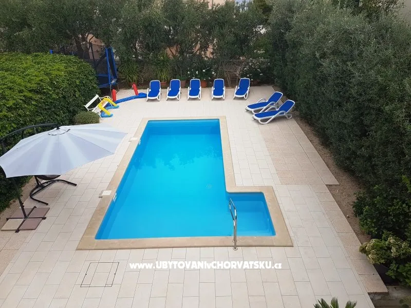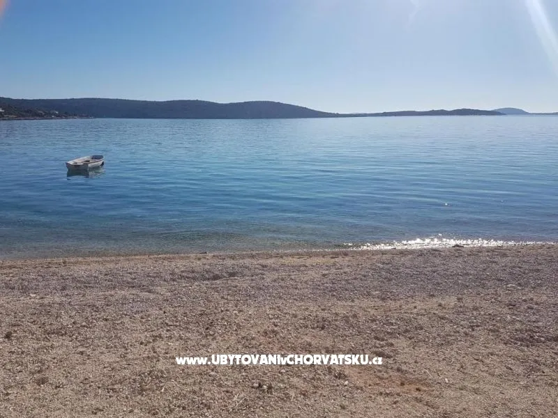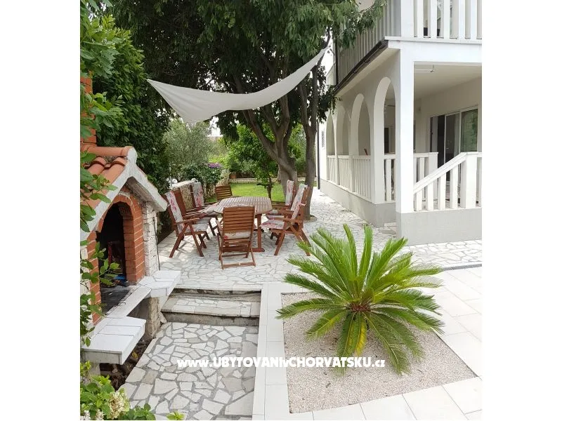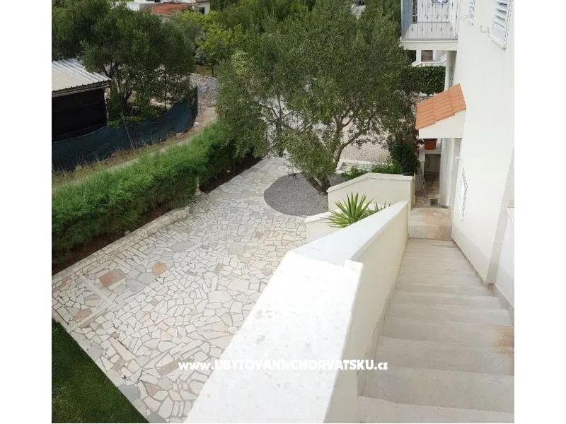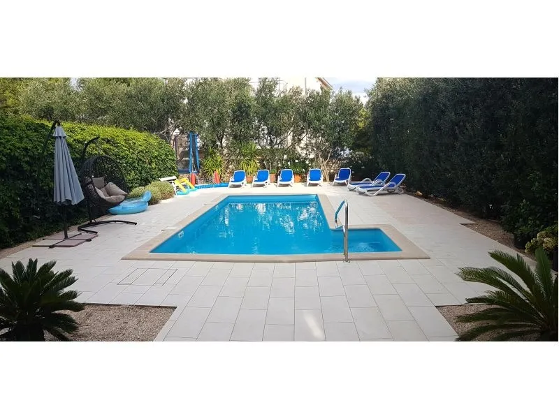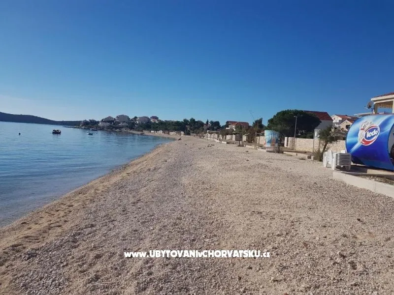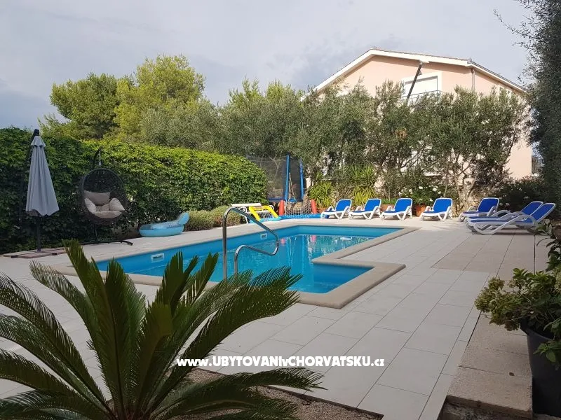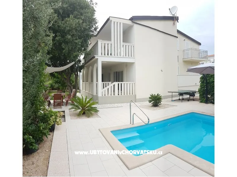Kuća je smještena na poluotoku , udaljena od Trogira 25 km i Primoštena 23 km , Split 48 km Kuća je na dva kata , prizemlje : kuhinja , dnevni boravak ,kupatilo , dvije sobe sa kupatilom i bračni krevet , soba sa krevetom na kat , 2 klima uređaja ( 1 u dnevnom boravku ,1 u hodniku - sobe) velika terasa cca 30m2 , sa terase se izlazi u vrt i bazen. U vrtu stol za 10 osoba . Kat : kuhinja , dnevni boravak 2 ,kupatilo , dvije sobe i bračni krevet , soba sa krevetom na kat , 4 klima uređaja ( 1 u dnevnom boravku ,3 - sobe) velika terasa cca 30m2 , U sklopu kuće je natkriveni ( sjena )parking za 5 vozila . Plaža je udaljena 100-120m na istok i zapad ( poluotok)