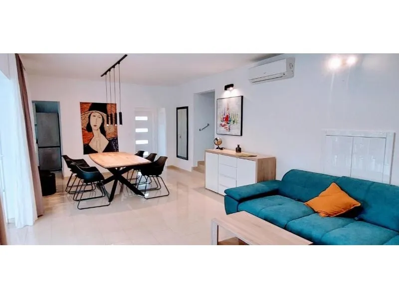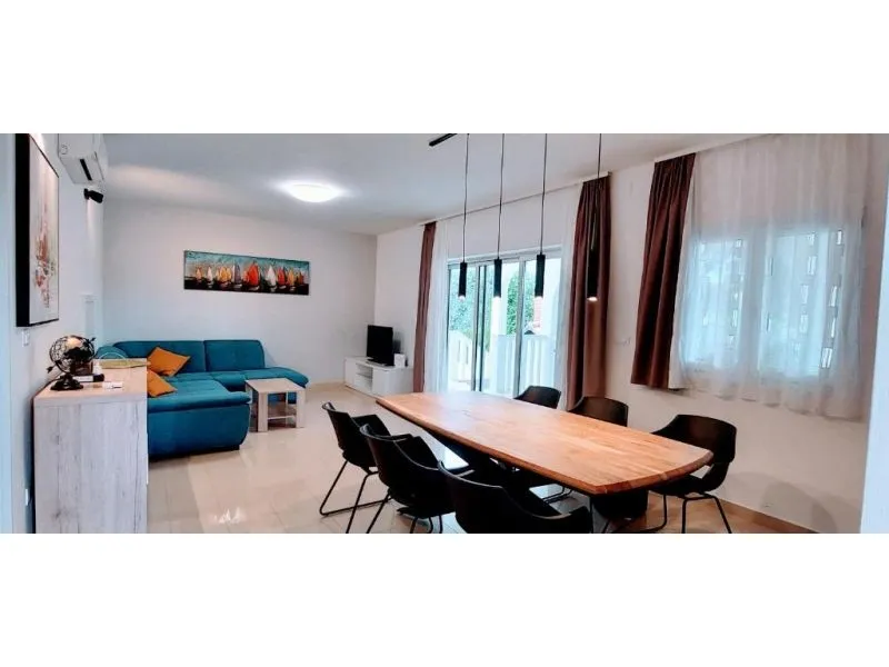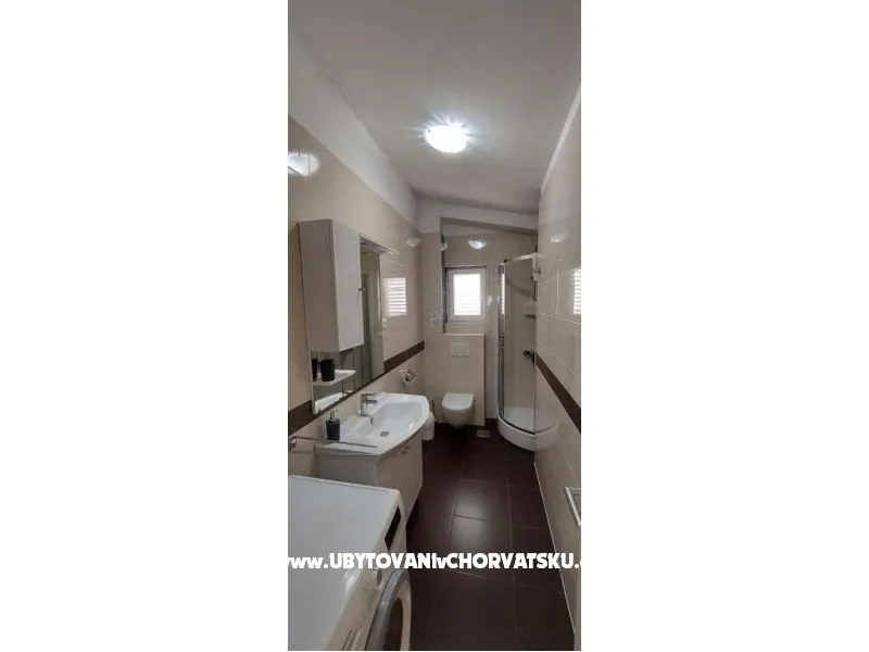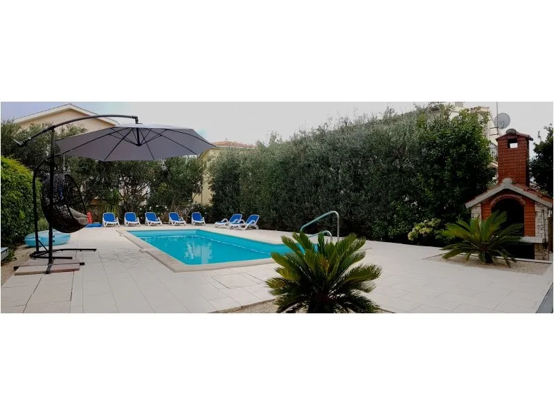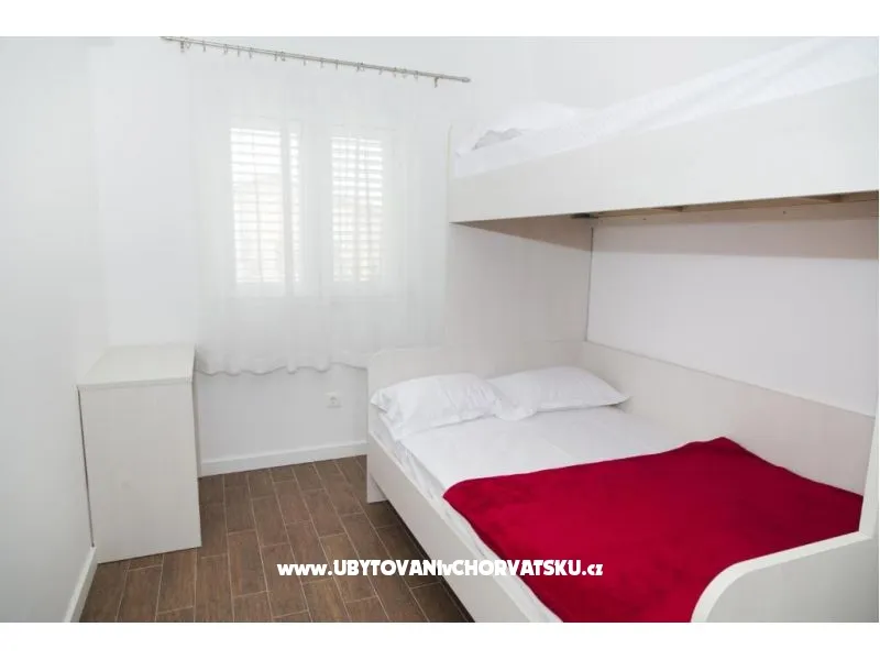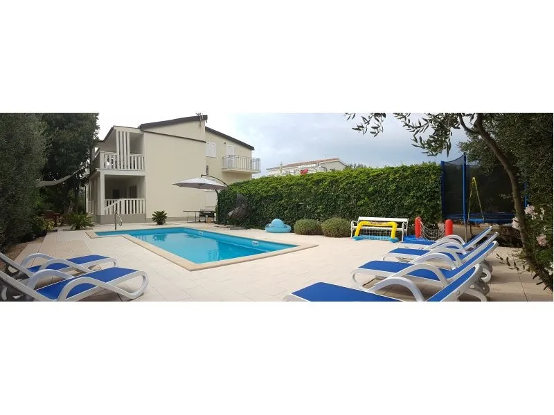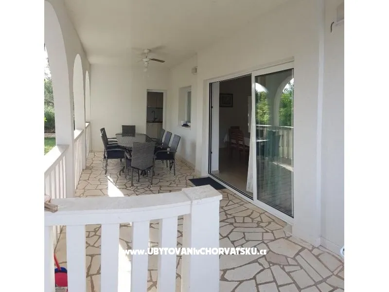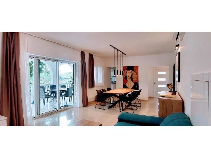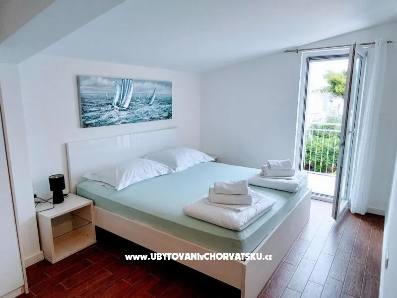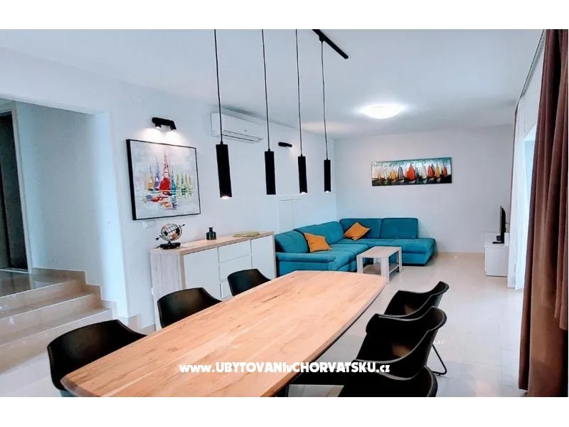 Kuća je smještena na poluotoku , udaljena od Trogira 25 km i Primoštena 23 km , Split 48 km Kuća je na dva kata , prizemlje : kuhinja , dnevni boravak ,kupatilo , dvije sobe sa kupatilom i bračni krevet , soba sa krevetom na kat , 2 klima uređaja ( 1 u dnevnom boravku ,1 u hodniku - sobe) velika terasa cca 30m2 , sa terase se izlazi u vrt i bazen. U vrtu stol za 10 osoba . Kat : kuhinja , dnevni boravak 2 ,kupatilo , dvije sobe i bračni krevet , soba sa krevetom na kat , 4 klima uređaja ( 1 u dnevnom boravku ,3 - sobe) velika terasa cca 30m2 , U sklopu kuće je natkriveni ( sjena )parking za 5 vozila . Plaža je udaljena 100-120m na istok i zapad ( poluotok)