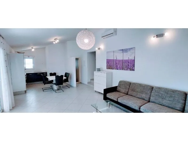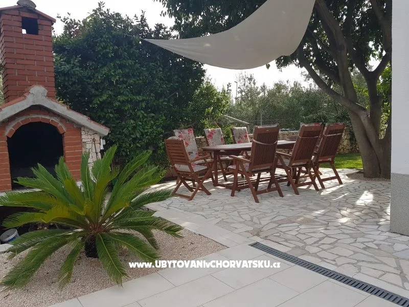 Kuća je smještena na poluotoku , udaljena od Trogira 25 km i Primoštena 23 km , Split 48 km Kuća je na dva kata , prizemlje : kuhinja , dnevni boravak ,kupatilo , dvije sobe sa kupatilom i bračni krevet , soba sa krevetom na kat , 2 klima uređaja ( 1 u dnevnom boravku ,1 u hodniku - sobe) velika terasa cca 30m2 , sa terase se izlazi u vrt i bazen. U vrtu stol za 10 osoba . Kat : kuhinja , dnevni boravak 2...