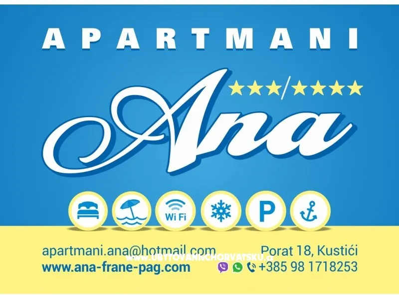 Iznajmljujemo apartmane na otoku Pagu, u malom selu - Kustići. Nalazimo se prvi red do mora ( 20 metara ) i ispred kuće je naša privatna pješčana plaža. Svi apartmani su klimatizirani i imaju pristup wi fi . U neposrednoj blizini apartmana nalazi se cafe bar, restoran, pekara i trgovina. Naši apartmani su idealno mjesto za obitelji s djecom, kao i za sve one koji žele provesti svoj odmor na mirnom i idiličnom mjestu. Apartmani su komforni i moderno opremljeni ( klima, tv, internet, 2 parkirna mjesta po apartmanu ).. Na raspolaganju vam je i vanjski roštilj sa sjenicom, vanjski tuš, spremište za bicikle, vez za čamac, suha marina. Također imate i mogućnost kupnje vrhunskog domaćeg vina, sira ili rakije i svježe divlje ribe. WEB: www.ana-frane-pag.com