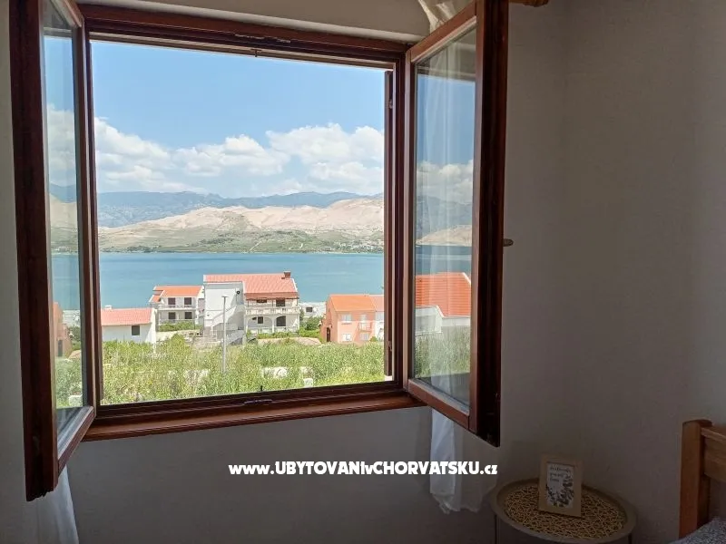 na katu, zaseban ulaz, dvije spavaće sobe, kuhinja, kupaonica i dnevni boravak. Terasa prostrana s pogledom na cijeli zaljev, plažu i grad Pag. Plaža 200 m, grad 1600, Zrće-Novalja 20 minuta parking