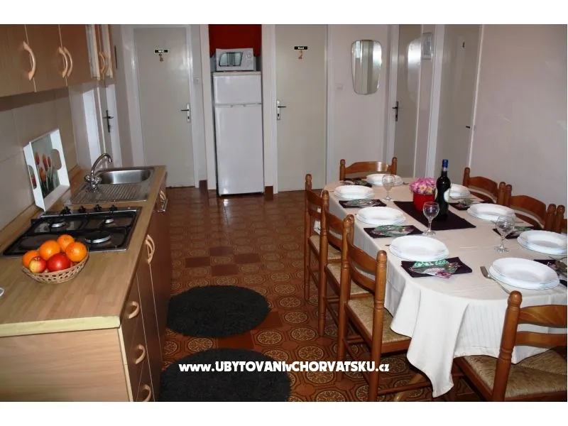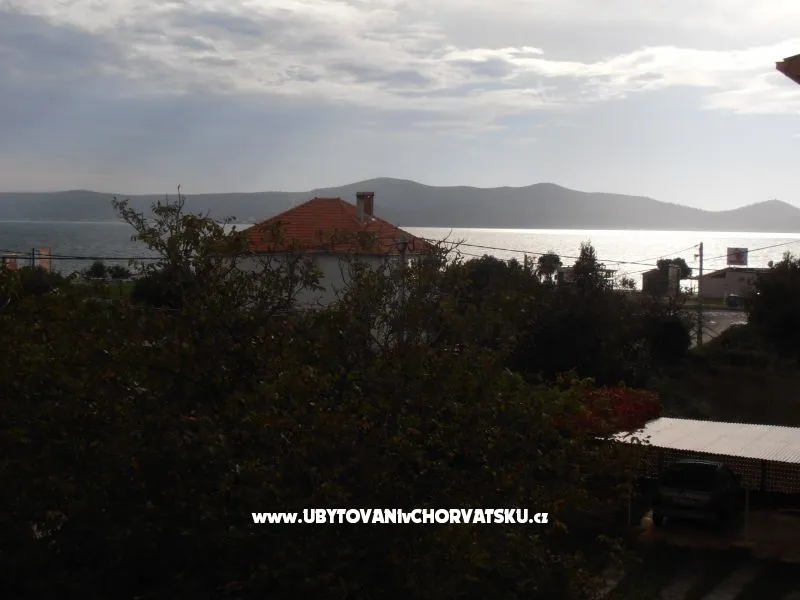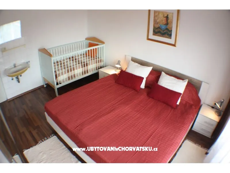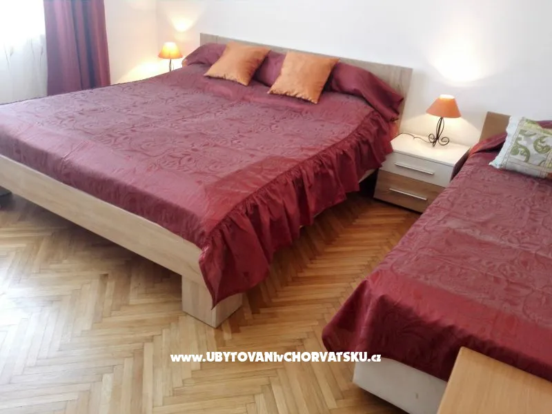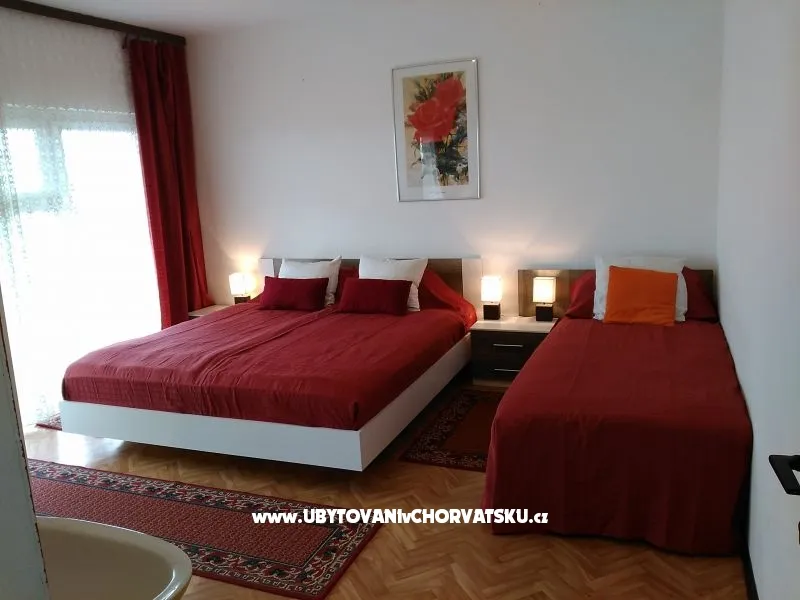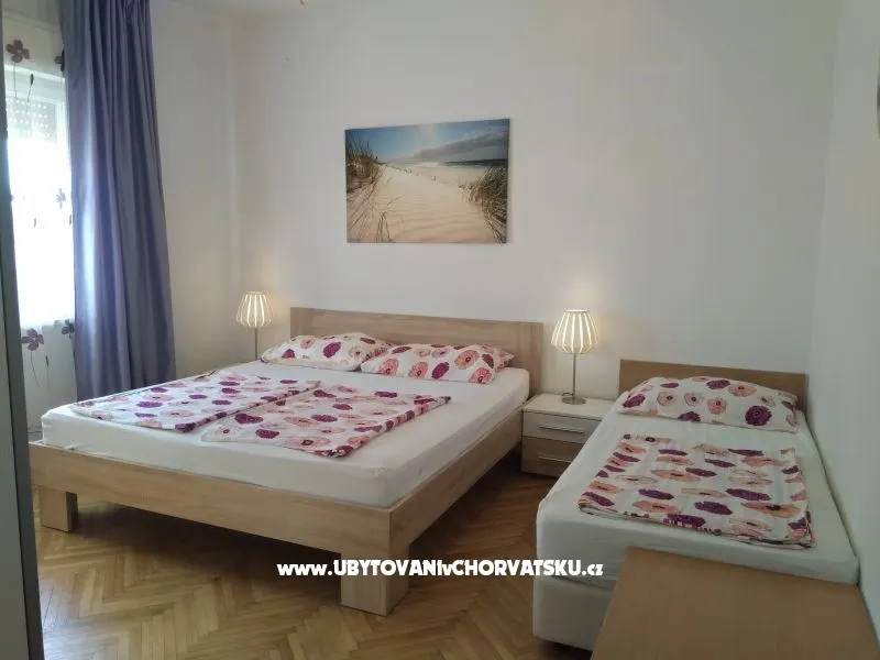3 spavače sobe (3,3,2)+ dnevni boravak (2), kuhinja, 2xkupatilo, natkrivena terasa, pogled na more, na spratu, poseban ulaz. Parking u dvorištu. Povoljno za 1/2/3 familije.. Ležaljke u vrtu, bazen za djecu <10 god i gril